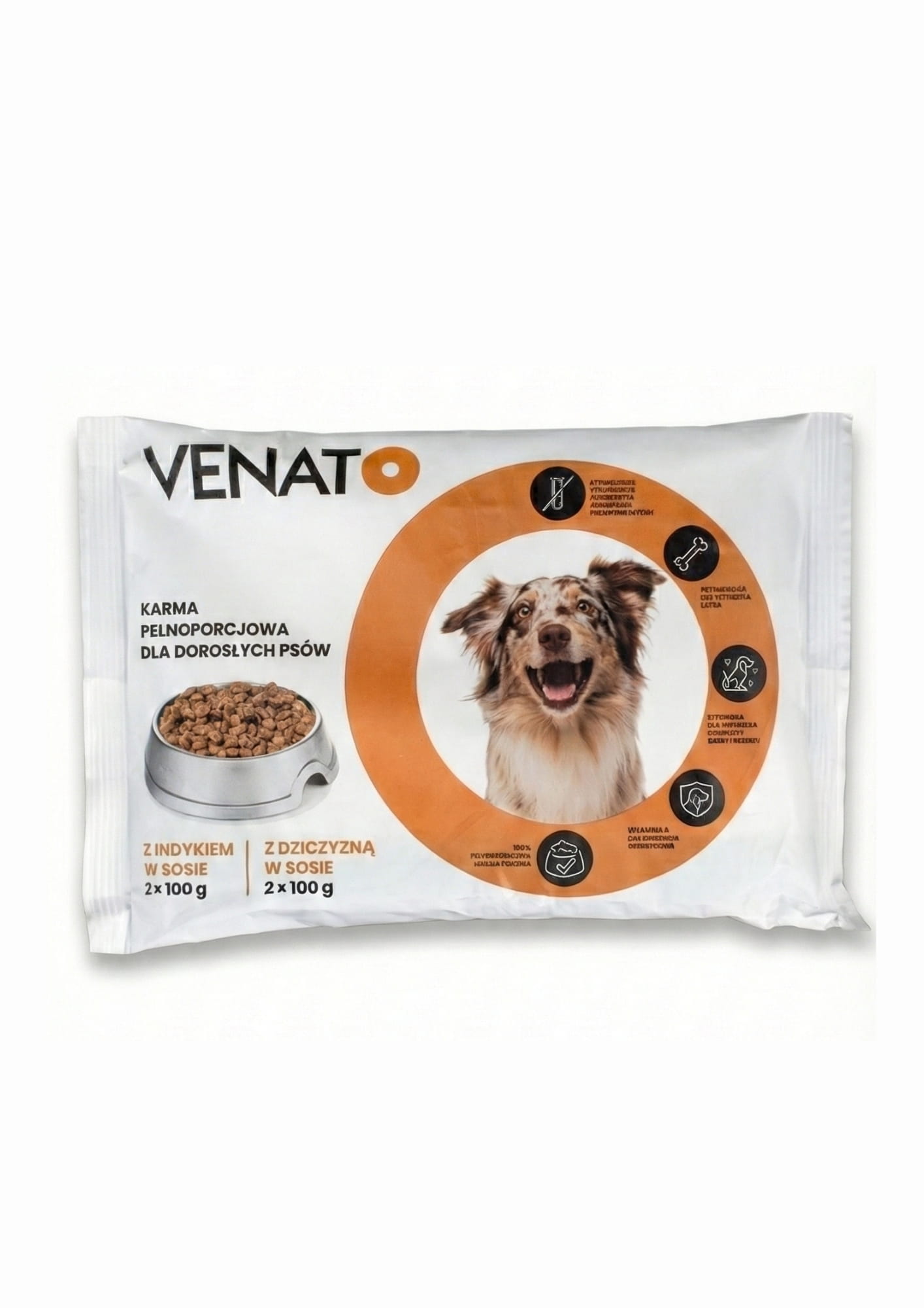 Karma mokra VENATO z dziczyzną w sosie i z indykiem w sosie to pyszny, pełnowartościowy posiłek, który dostarczy Twojemu psu wszystkiego, czego potrzebuje do zdrowego i aktywnego życia. Zawiera wysokiej jakości mięso, witaminy oraz minerały wspierające kondycję, odporność i witalność.