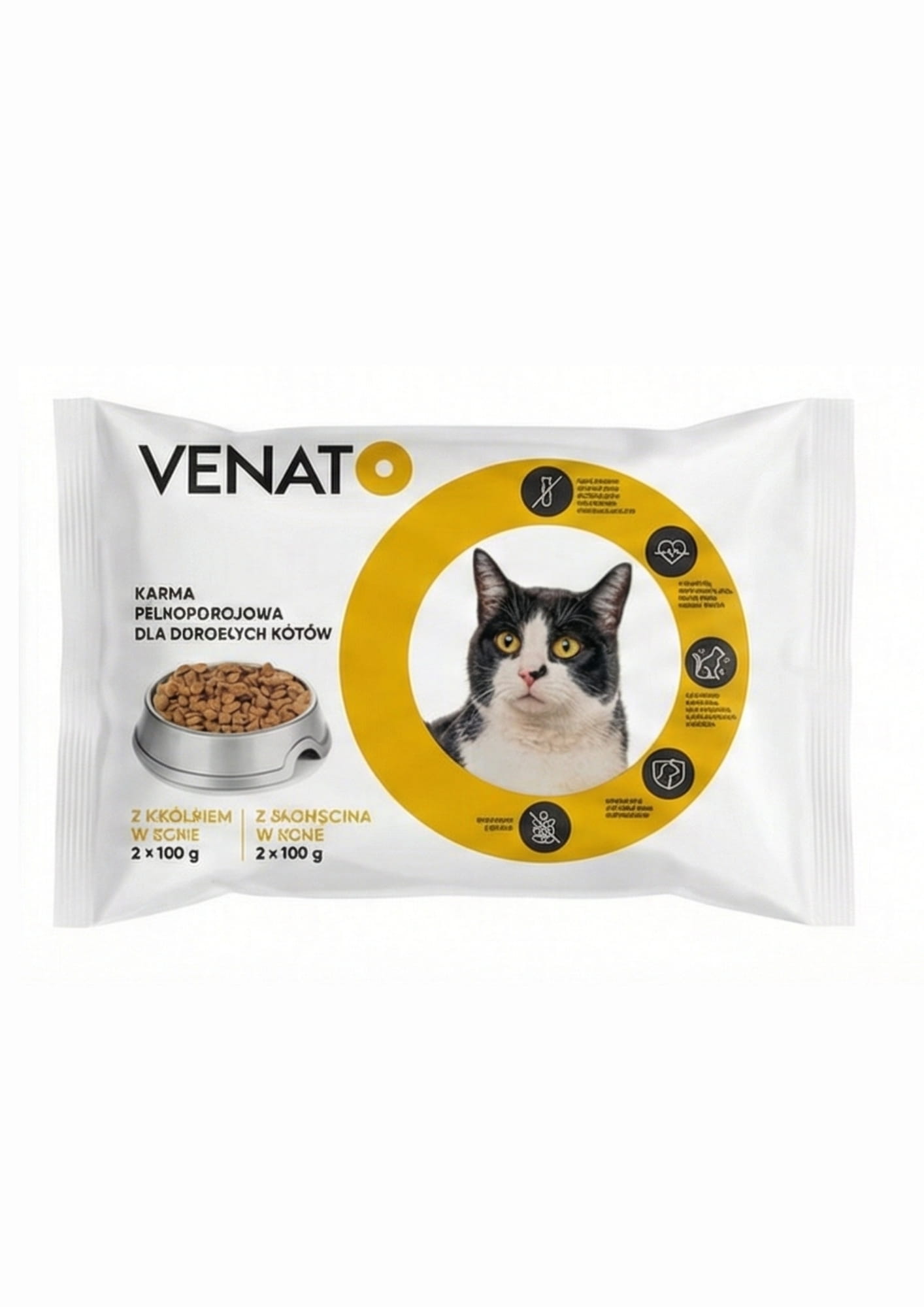 Karma mokra VENATO z królikiem w sosie i jagnięciną w sosie to pełnoporcjowy posiłek, który dostarcza kotu wszystkich niezbędnych składników odżywczych w apetycznej, wilgotnej formie. Dzięki wysokiej zawartości królika i jagnięciny, nasze karmy są bogate w łatwostrawne białko, które wspiera zdrowie mięśni oraz utrzymanie odpowiedniej kondycji ciała. Naturalne składniki oraz aromatyczny sos zapewniają kotu wyjątkowy smak i dodatkowe nawodnienie. VENATO to idealny wybór dla kotów o wrażliwym układzie pokarmowym, które potrzebują smacznego, zdrowego i dobrze zbilansowanego posiłku na co dzień.