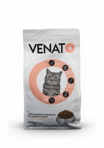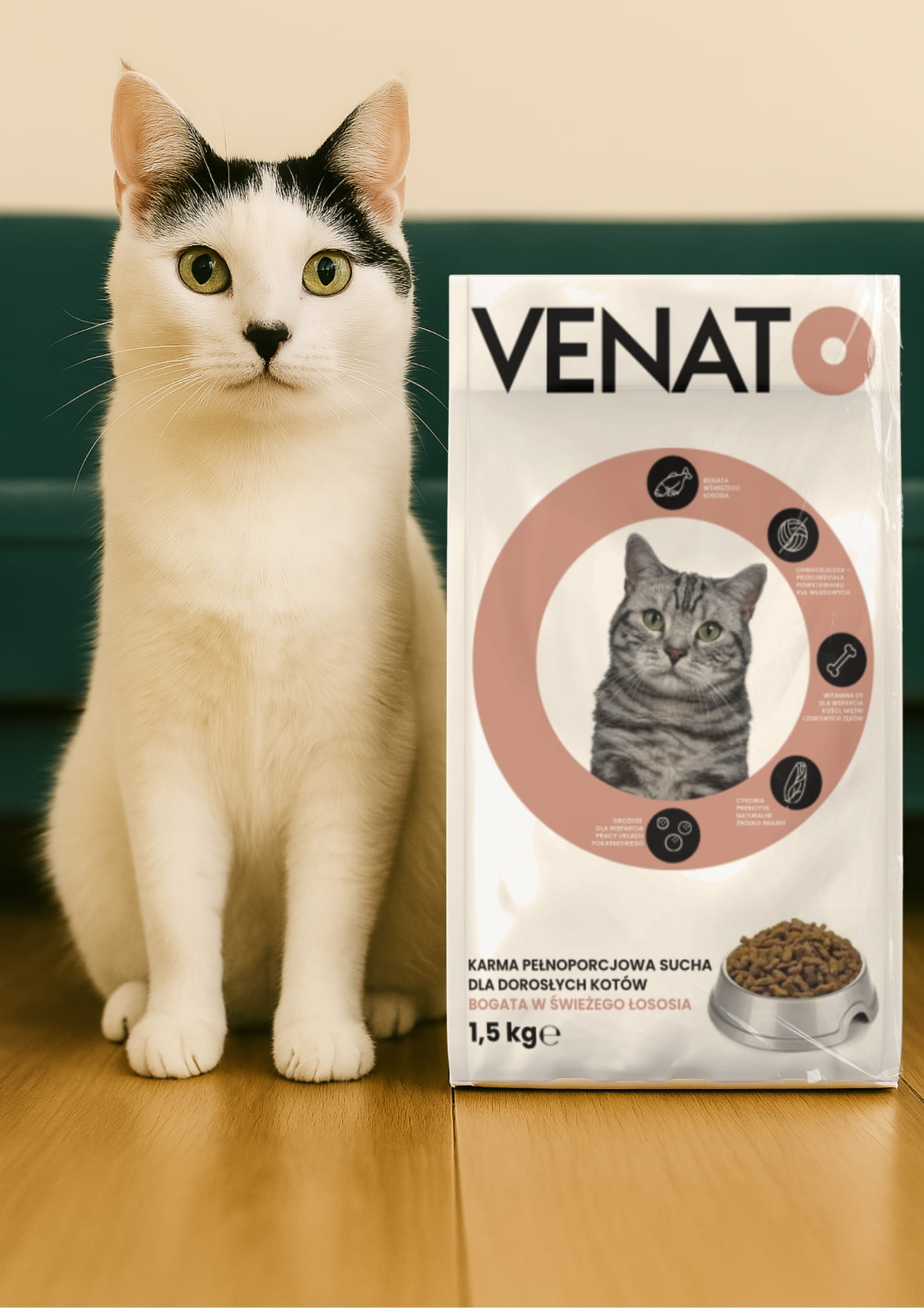 Pełnoporcjowa karma sucha VENATO bogata w świeżego łososia to pełnoporcjowy posiłek dla kotów wszystkich ras, który dostarcza niezbędnych składników odżywczych, wspierając zdrowie i witalność Twojego pupila. Świeży łosoś, będący głównym składnikiem karmy, to doskonałe źródło białka i kwasów tłuszczowych Omega-3, które wspierają zdrowie skóry, sierści oraz układu sercowo-naczyniowego. Dzięki naturalnym składnikom, karma VENATO jest idealna dla kotów o wrażliwym układzie pokarmowym. To pyszny i zdrowy wybór, który dostarcza kotu energii na co dzień, wspomaga trawienie i zapewnia lśniącą sierść.